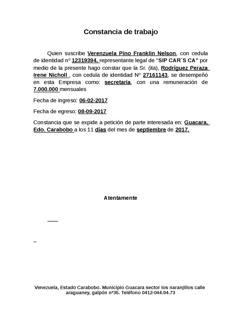 Se extiende la presente constancia laboral a solicitud del/de la trabajador/a mencionado/a, a petición expresa y para los fines correspondientes.